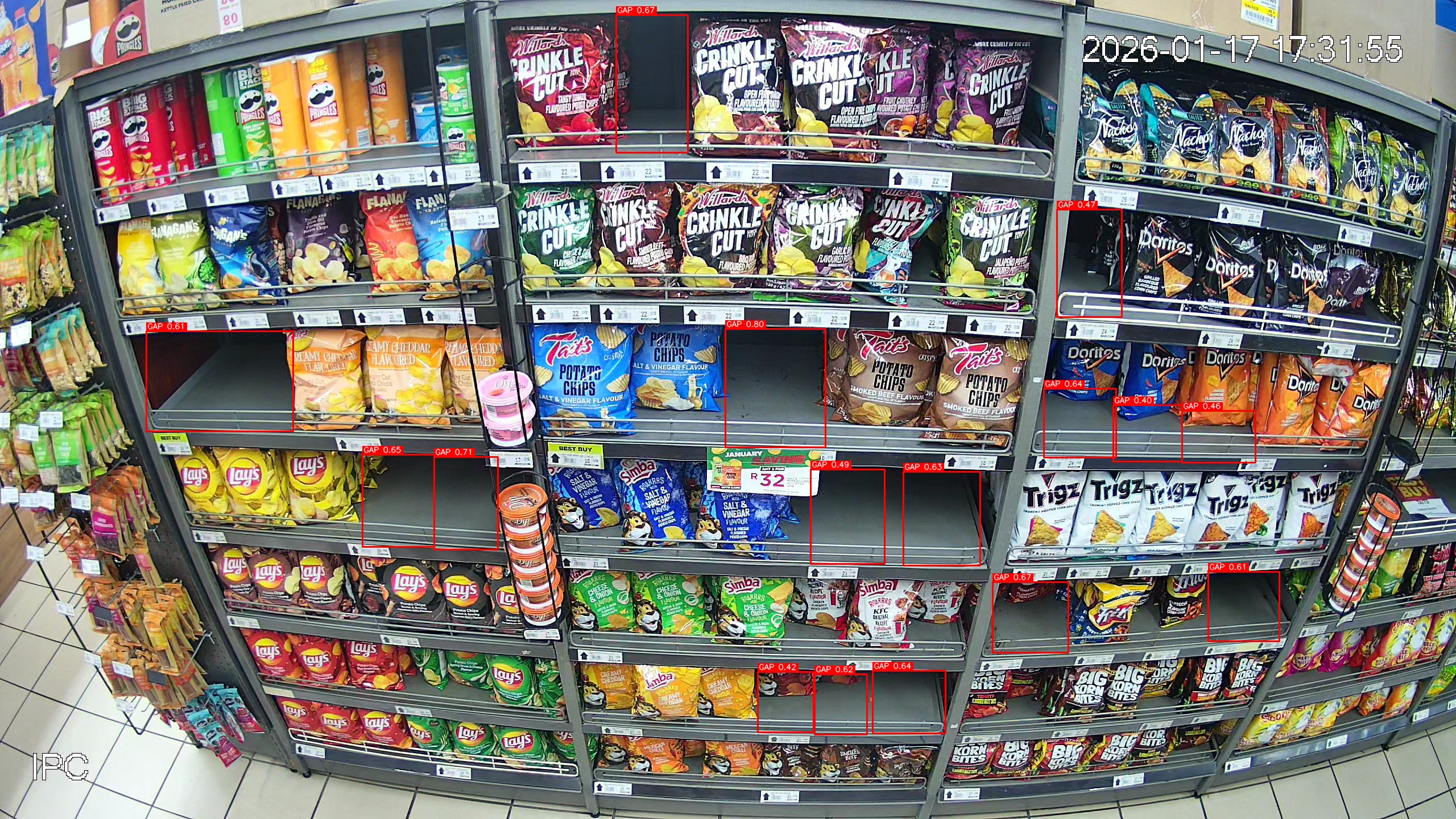 Red boxes indicate detected gaps requiring restocking attention